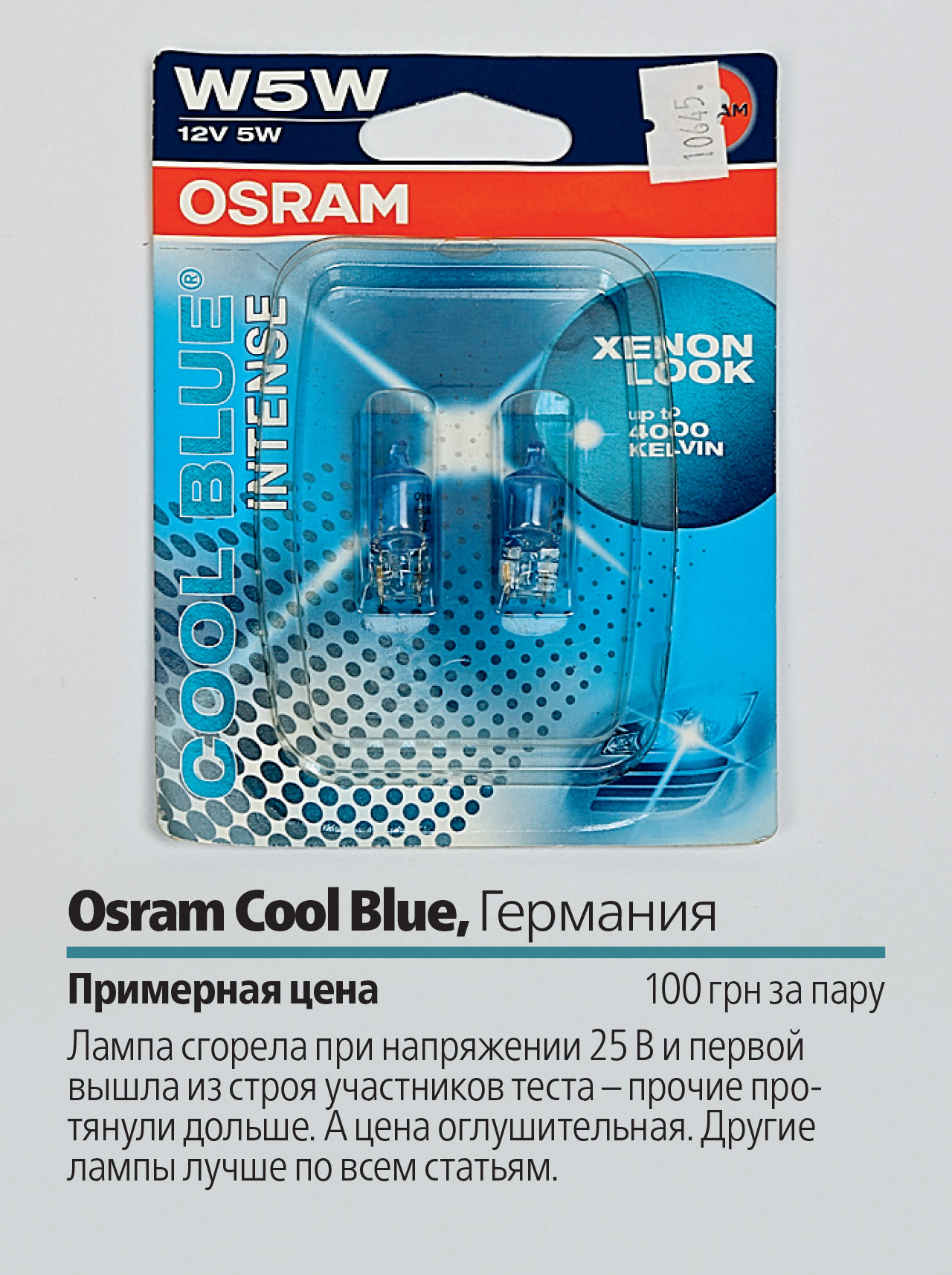 Как долго должны работать такие лампы? По данным производителей, 400–500 часов. Нас интересовали не абсолютные цифры, а относительные: какая лампа прослужит дольше? Некоторые из лампочек обещают повышенный срок службы, а другие, напротив, намекают на «интенсивный ксеноновый эффект». Да и цены разнятся вдесятеро – от 8 гривен за Osram Original до 50 грн за Osram с эффектом Cool Blue.