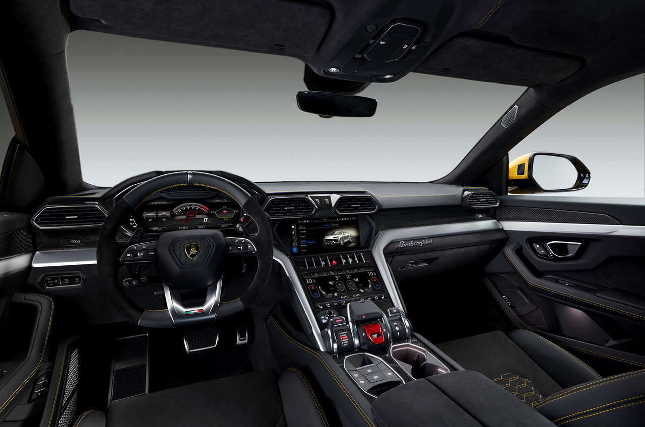 В салоне Уруса на центральной консоли установлены сразу два дисплея: верхний для мультимедийной системы и нижний для климат-контроля. Приборная панель полностью цифровая. На тоннеле – селектор режимов движения Tamburo (барабан). Их шесть: Strada (дорога), Sport, Corsa (гонки), Sabbia (песок), Terra (грунт) и Neve (снег). Список оборудования включает в себя спортивные передние сиденья с функцией вентиляции и массажа, а также с электрической регулировкой в 18 направлениях. Кроме того, будет доступна 1700-ваттная акустическая система Bang & Olufsen с трехмерным звуком и 21 динамиком.