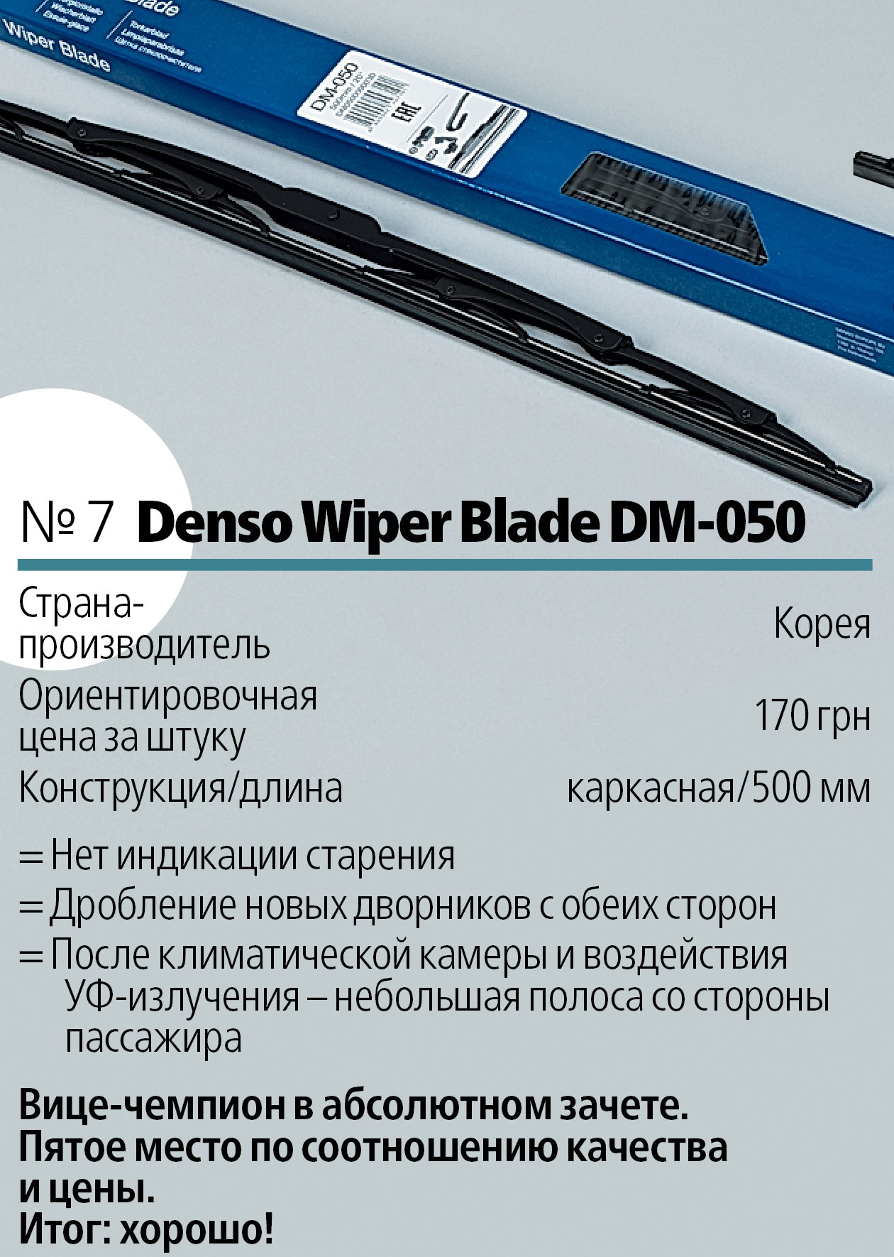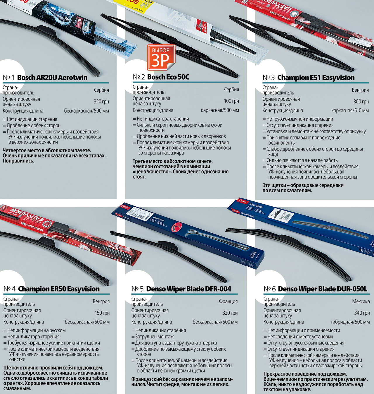 После пребывания в климатической камере никаких следов растрескивания или нарушения покрытия образцов, а также налета мы не обнаружили. Абсолютным чемпионом по сумме баллов оказался бескаркасный Valeo UM-650. Последнее место занял Trico NeoForm NF-500 – тоже бескаркасный. Выходит, что конструкция не дает полной гарантии успеха.