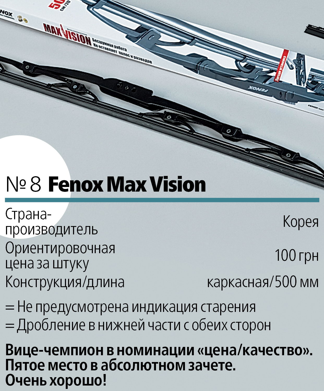 Теперь посмотрим с учетом соотношения цены и качества. В лидеры выходят простейшие каркасные щетки – Fenox Max Vision и Bosch Eco 50C. Так какие же щетки приобрести? На наш взгляд, имеет смысл просто чаще менять дворники. Простые каркасные конструкции если в чем-то и проигрывают, то только во внешности. Впрочем, и выглядят они не настолько хуже, насколько дешевле стоят.