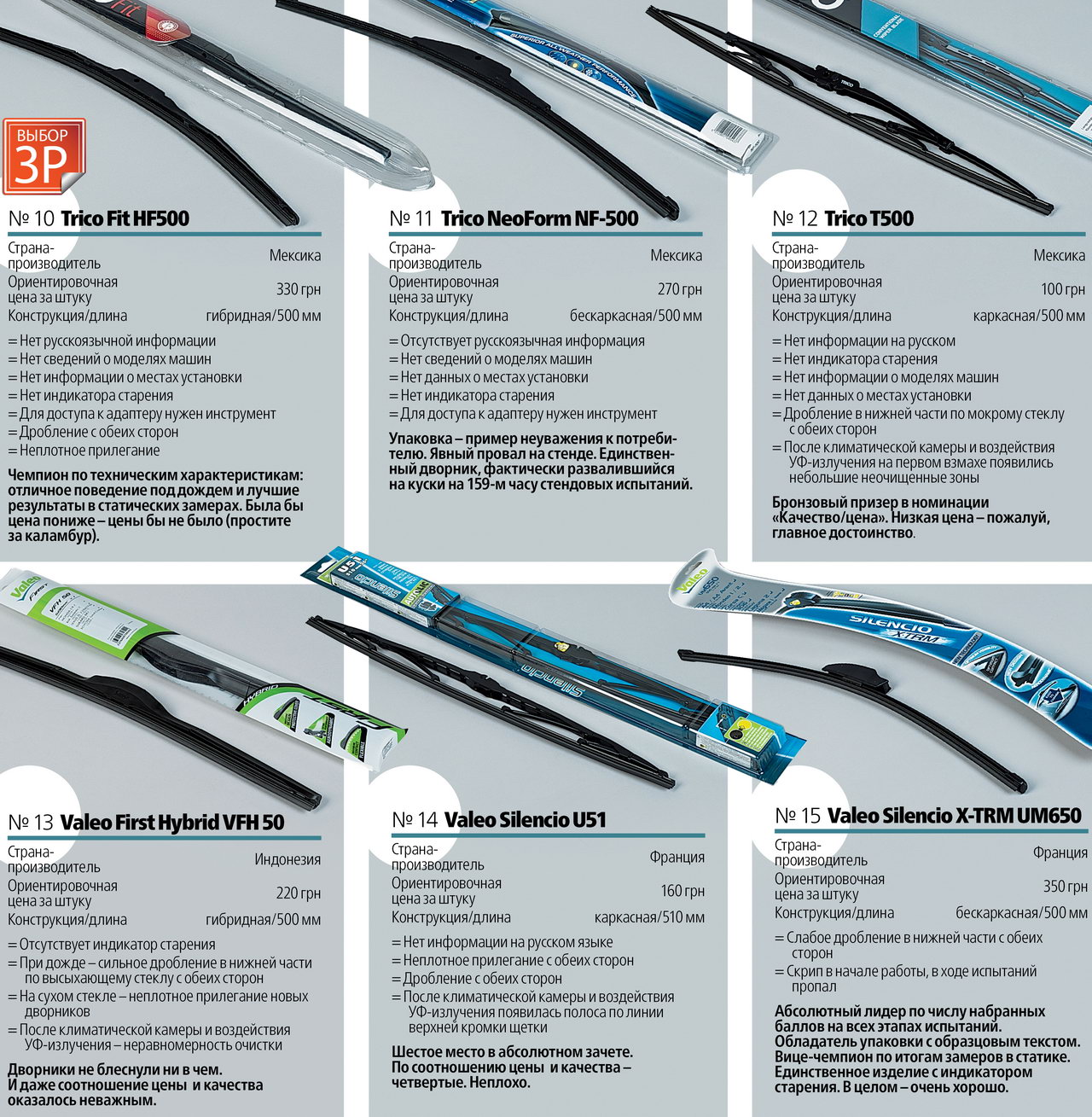 А если оценивать только рабочие характеристики? Тогда в лидеры выходит гибридный Trico Fit HF500. Аутсайдер не поменялся – это вновь Trico NeoForm NF-500, бескаркасный. Вот и получается, что и бренд не дает полной гарантии успеха.