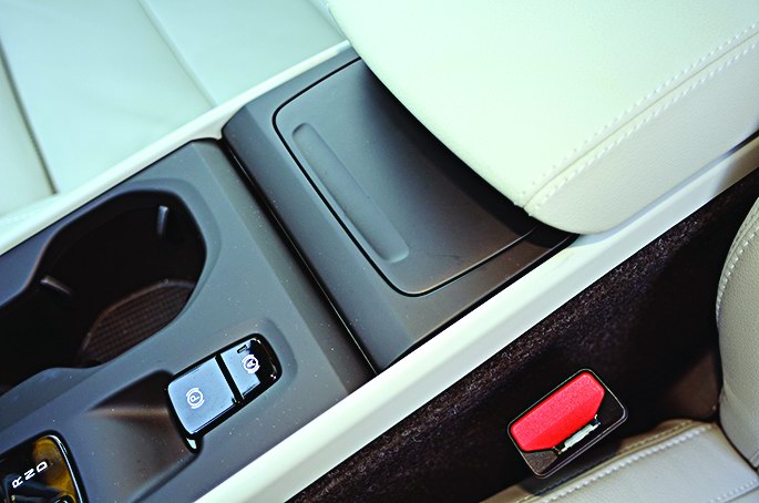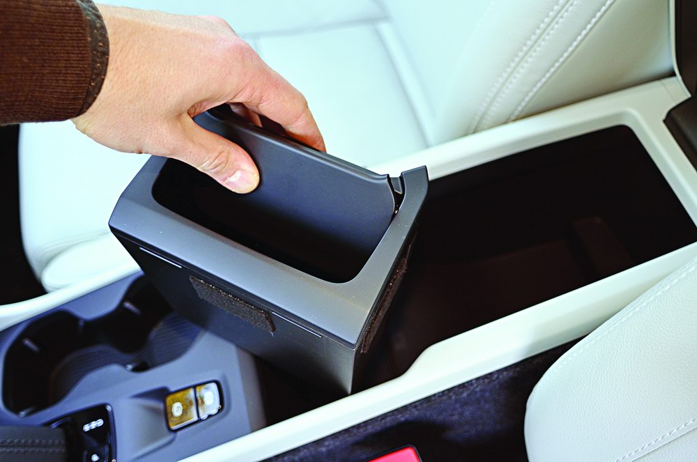 Жить со всем этим в XC40 намного проще. Потому что сумку вешаем на крючок, откидывающийся из крышки перчаточного ящика. Смартфон ложится в нишу на консоли, оснащенную беспроводной зарядкой. Ноутбук пристраиваем в карман двери – ради этой высокой цели, кстати, дверные карты лишились динамиков. Чистые салфетки тянем из-под подлокотника, а грязные отправляем почти по тому же адресу: здесь есть съемная корзина для мусора! На приборной панели нашелся даже слот для дисконтных карт на топливо – зачем таскать их в кошельке?