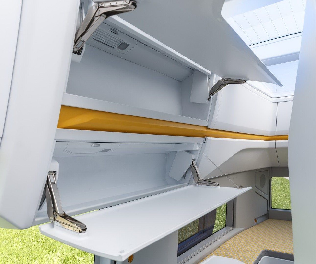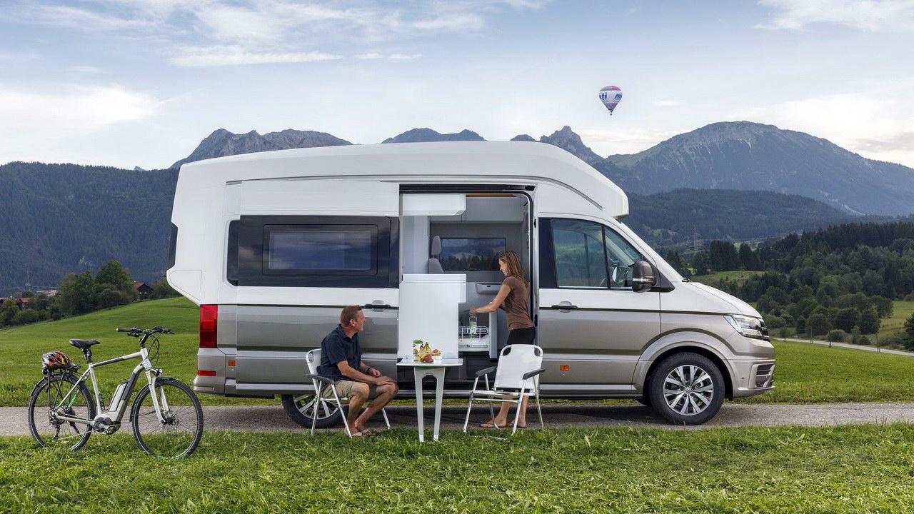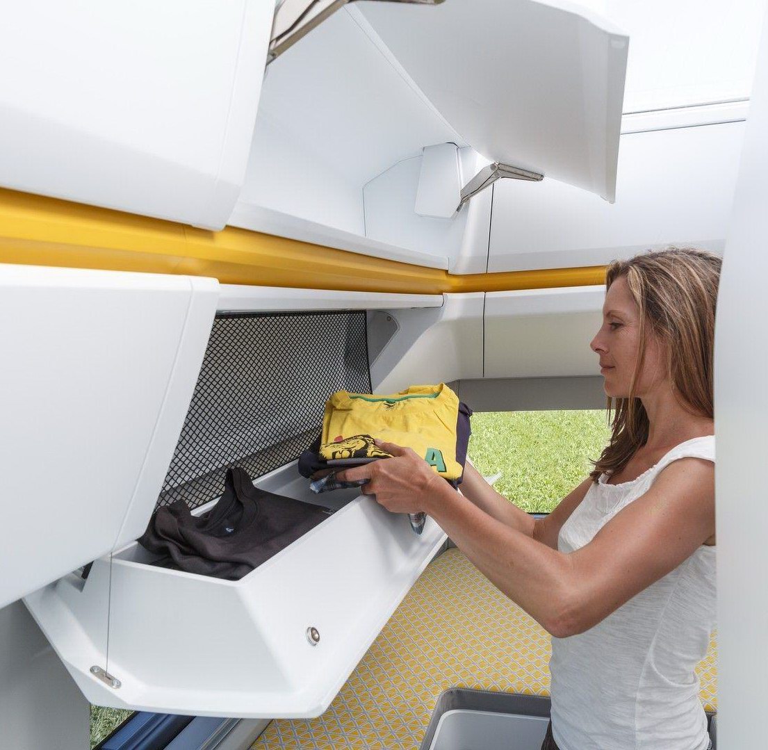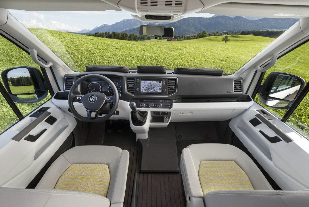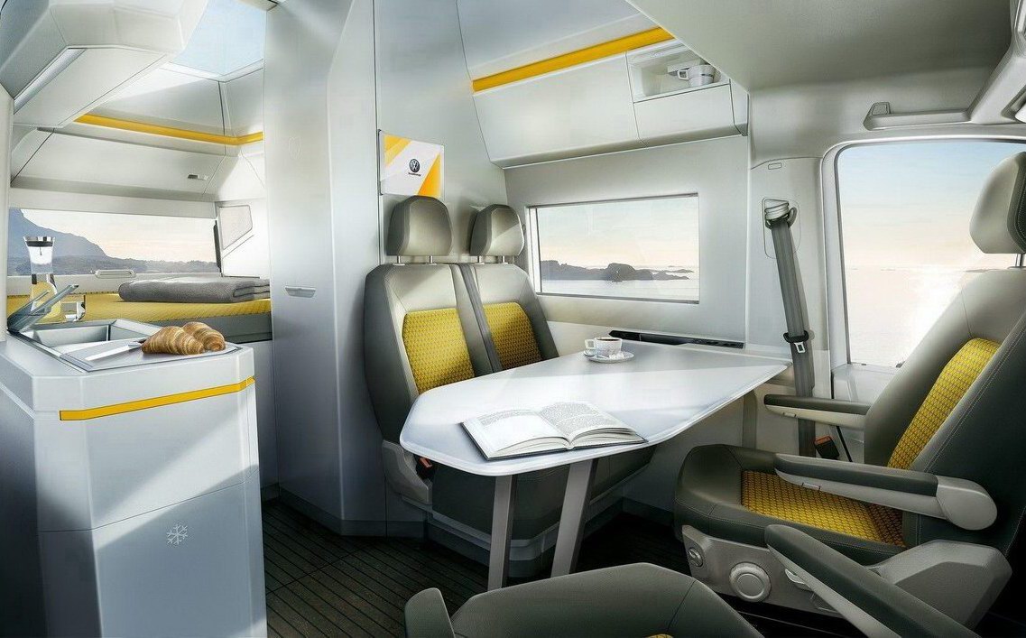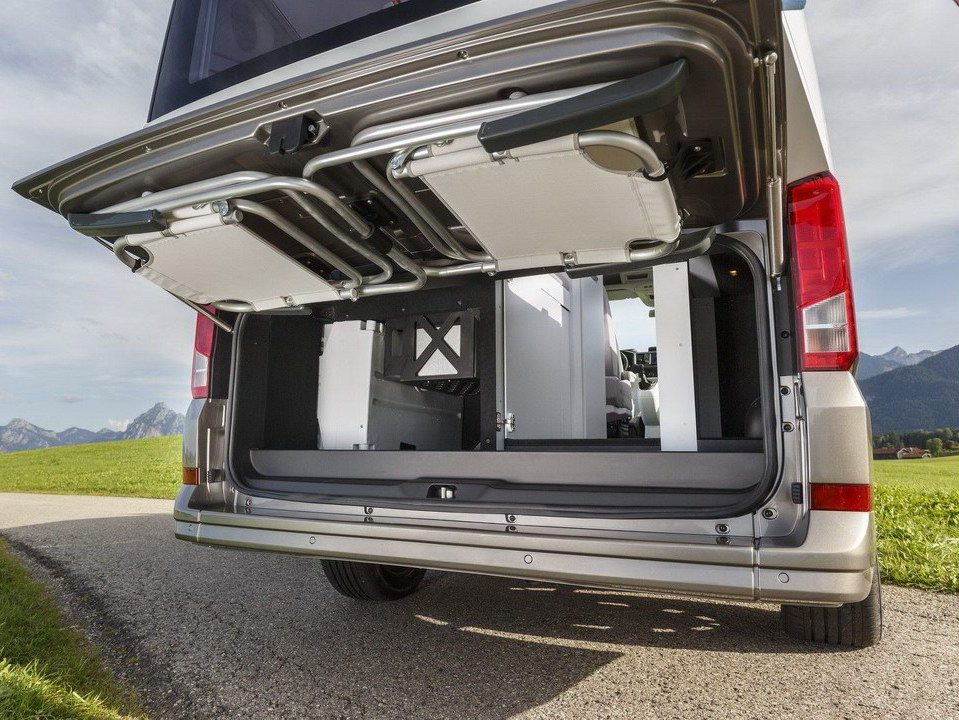 Внутри кэмпера можно стоять в полный рост – высота салона достигает 2,2 метра, а за задними дверьми есть вместительный багажный отсек размерами 1600х1850х720 миллиметров. Сверху – огромная прозрачная панорамная крыша.
