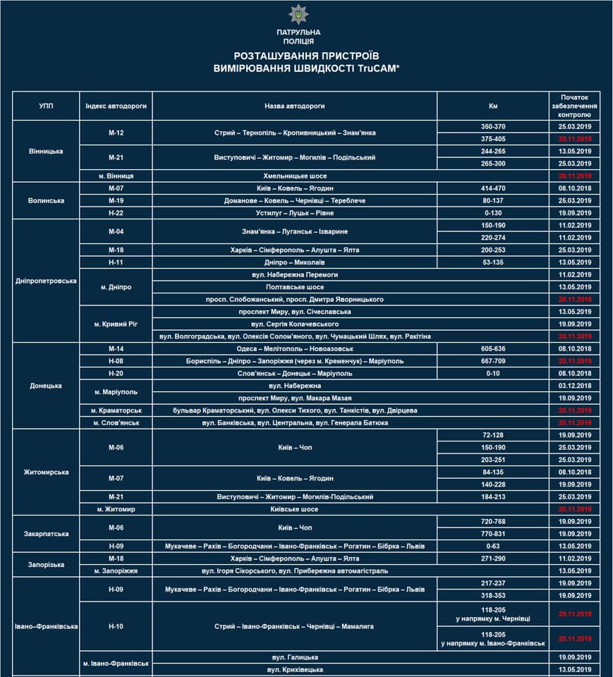 С 20 ноября на дорогах Украины добавится 57 новых участков, где для контроля скоростного режима будут использоваться приборы TruCAM.