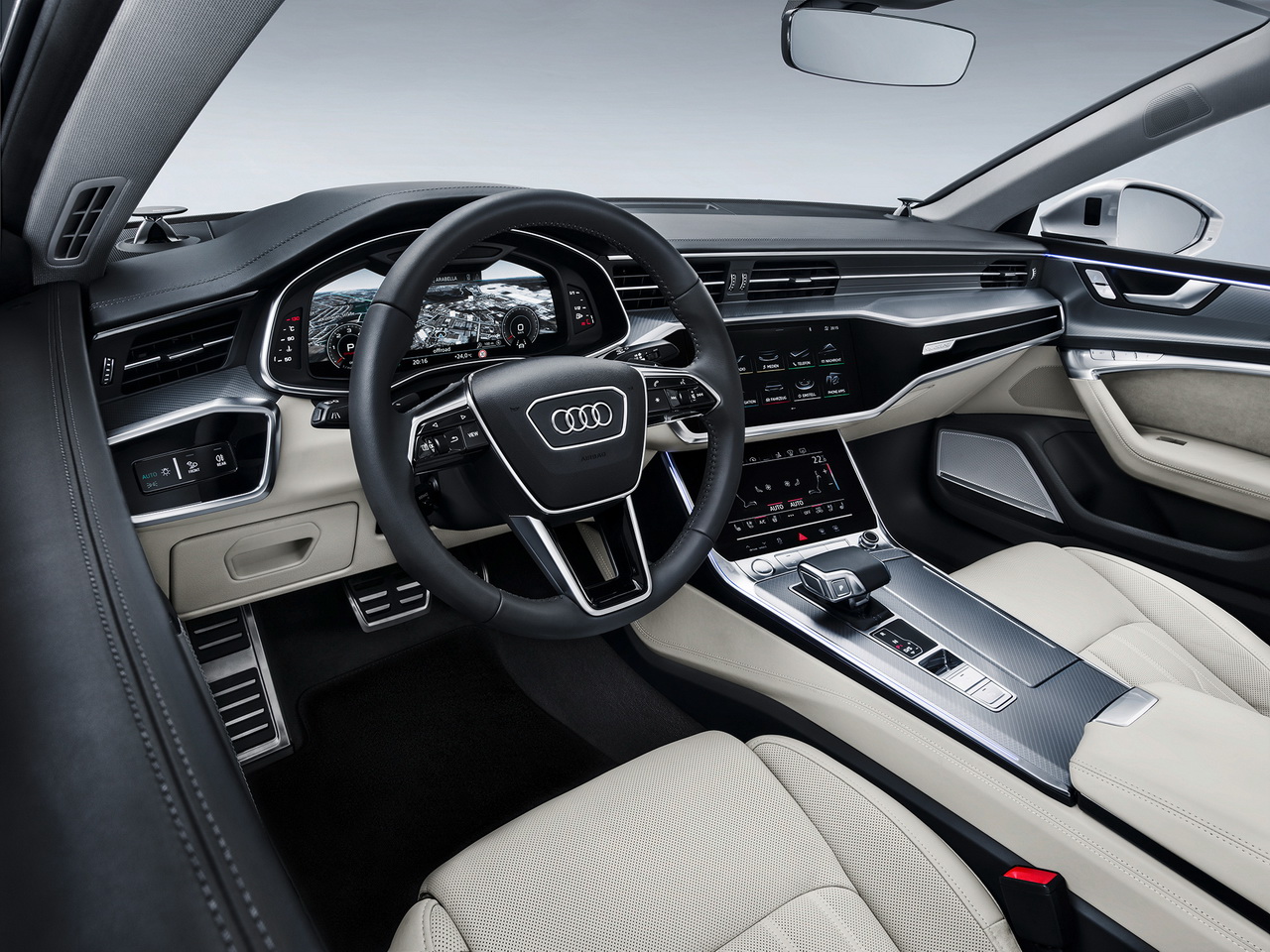 Дизайн салона большей частью позаимствован у флагманского седана A8: цифровая приборная панель диагональю 12,3 дюйма, а также два сенсорных дисплея на центральной консоли – верхний предназначен для информационно-развлекательной системы, верхний управляет климатом и навигацией. Опционально доступен проекционный дисплей. Благодаря интеллектуальному круиз-контролю автомобиль способен самостоятельно двигаться в пределах полосы – данные поступают с пяти радаров и камер, 12 ультразвуковых датчиков и лидара.