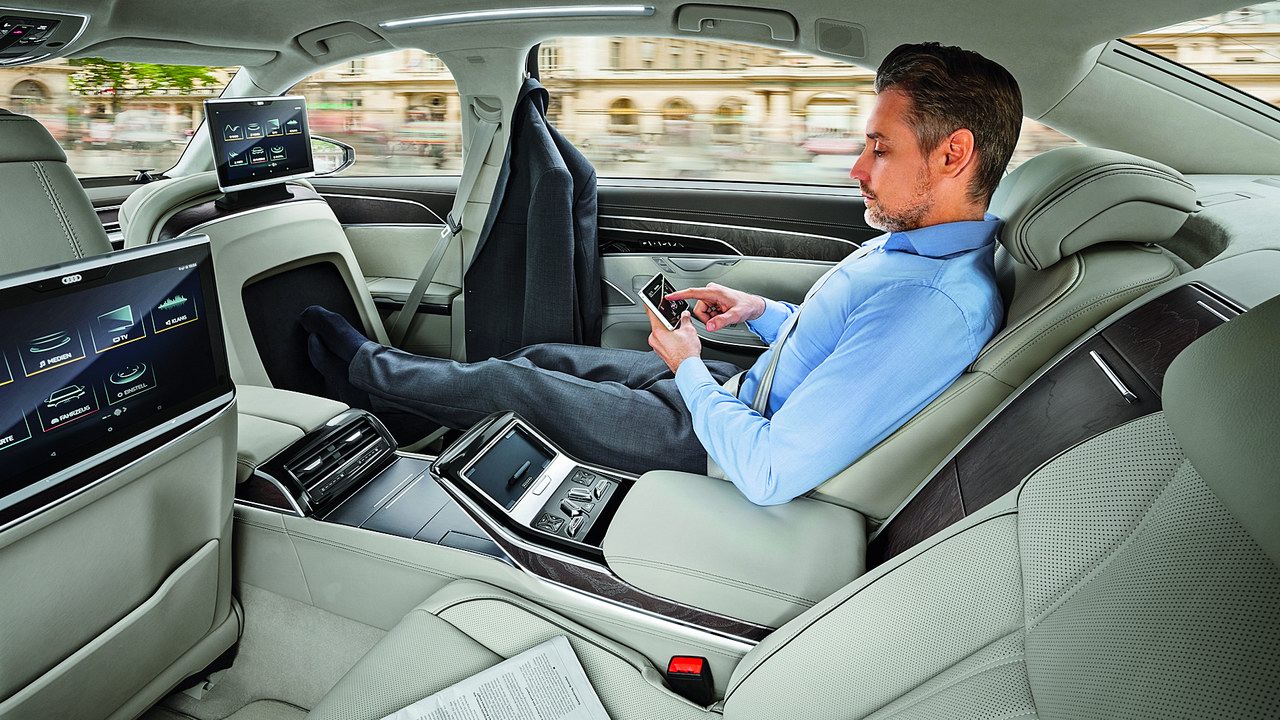 Не могу сказать, что сзади в длиннобазном А8 плохо. Здесь отлично. Чтобы к чему-то придраться, нужно быть лауреатом конкурса «Мистер сноб». Когда в твоем распоряжении удобная оттоманка, продвинутый массажер с площадкой для ступней, огромные планшеты на спинках передних кресел (их можно забрать с собой) и 5,7-дюймовый пульт управления бортовым функционалом, тяжело желать большего. Однако я уверен, что многие потенциальные клиенты желали бы. Большего пространства. Возможности раскинуться почти горизонтально. Ощущения особенного уюта.