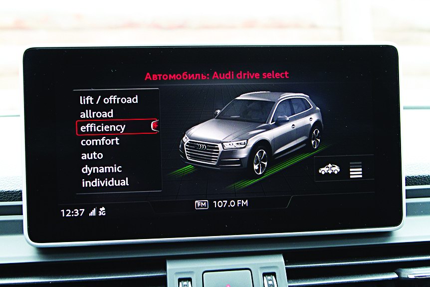 В общем, я не вижу нужды отнимать динамичным режимом 15 мм от клиренса – лучше просто перевести селектор 8-ступенчатой АКПП в положение S. Теперь можно быть уверенным, что SQ5 моментально сорвется с места или очень шустро ускорится при перестроении, причем в любом режиме Drive Select. Кстати, и экономичный Efficiency по-своему хорош. Если никуда не спешишь, он позволяет уложиться в 10-11 л в городе. Отличный показатель, с учетом объема и темперамента мотора.