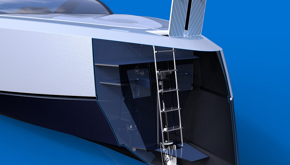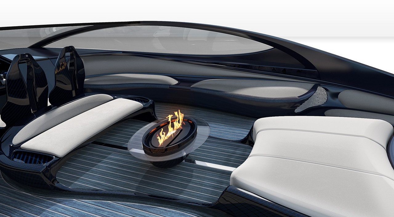 В отделке яхты используются, кожа, алюминий, натуральное дерево, мрамор. На лодке есть джакузи, бар, спальня, отдельная гостевая зона и… даже место для разведения костра.