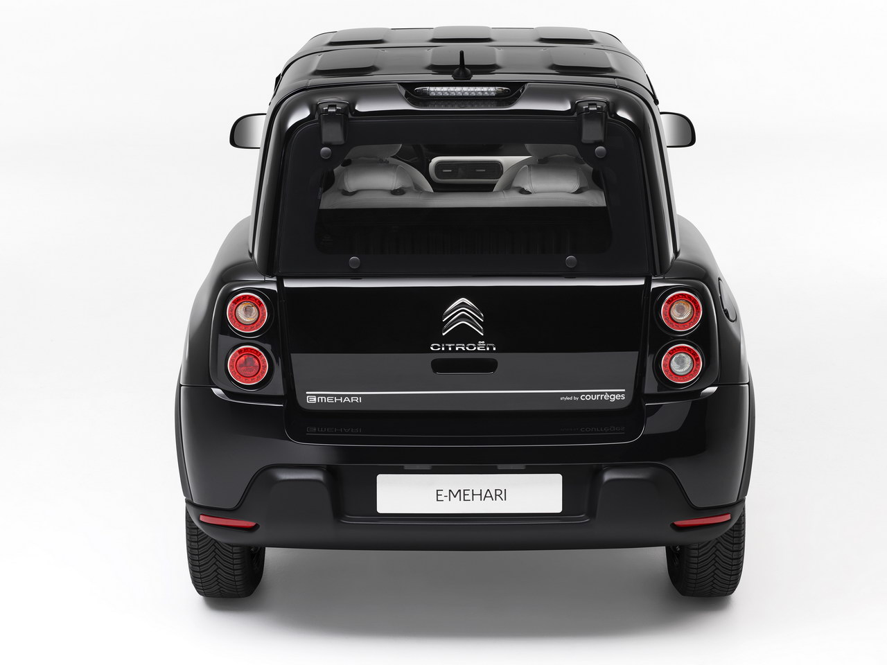 Четырехместный E-Mehari Styled by Courreges получил кузов и съемную крышу черного цвета, которые контрастируют с белой отделкой салона и передней панели из термоэластопласта. Кроме того, ручки стилизованы под рукоятки от дорожных сумок, а с пассажирской стороны появился ремешок с вышитым логотипом Courreges и алюминиевой номерной табличкой, сделанной с использованием шелкографии и покрытой лаком.