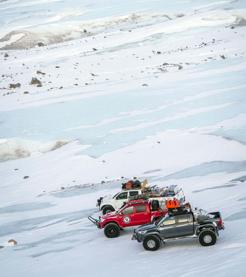 Команда выбрала три автомобиля, построенных исландской компанией Arctic Trucks – такого же типа транспорт используют в антарктических экспедициях. Новейшие автомобили были оснащены шинами Nokian Hakkapeliitta 44 от самого северного в мире производителя шин Nokian Tyres.