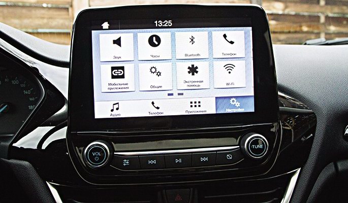 Из центральной консоли вырос центральный дисплей. В тестовой Фиесте установлен самый большой из возможных, 6,5-дюймовый тач-скрин мультимедийной системы Ford SYNC3. Есть голосовое управление, Android Auto, Apple CarPlay. Стильный дизайн оформления, простота меню и отзывчивость дисплея меня покорили. Но это прерогатива исключительно комплектации Business; версиям поскромнее, начиная с оснащения Trend, полагается 4,2-дюймовый экран, а базовая Ambiente его лишена напрочь.