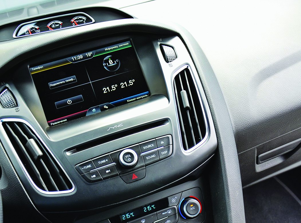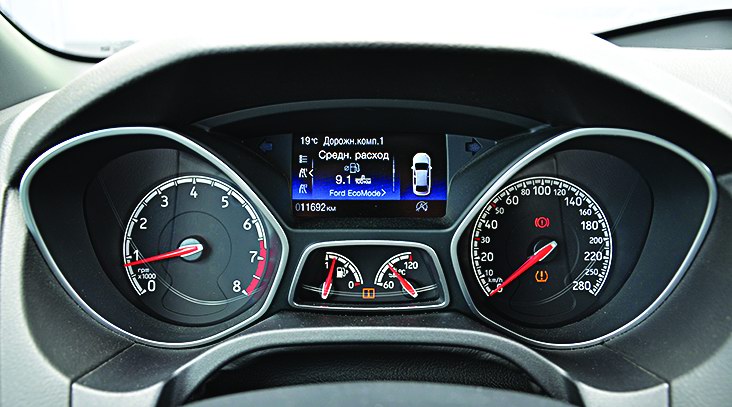 Кроме шикарных передних кресел, в салоне ST нашлись и другие отличия от обычных Фокусов. Это стильная рукоятка 6-ступенчатой механики, спортивные педали и троица не очень частых приборов: указатели производительности турбины, давления и температуры масла, расположенные поверху приборной панели.