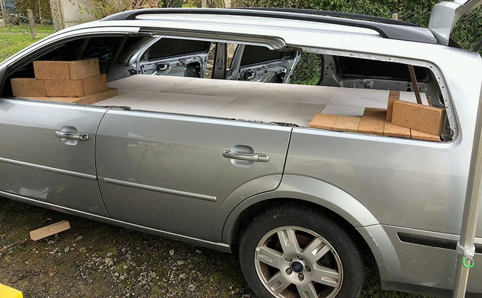 Творец удалил всю техническую начинку и элементы интерьера, а вместо боковых стекол установил металлические листы (лобовое и заднее стекла при этом остались штатными). Внутри же машину француз полностью обложил кирпичом.