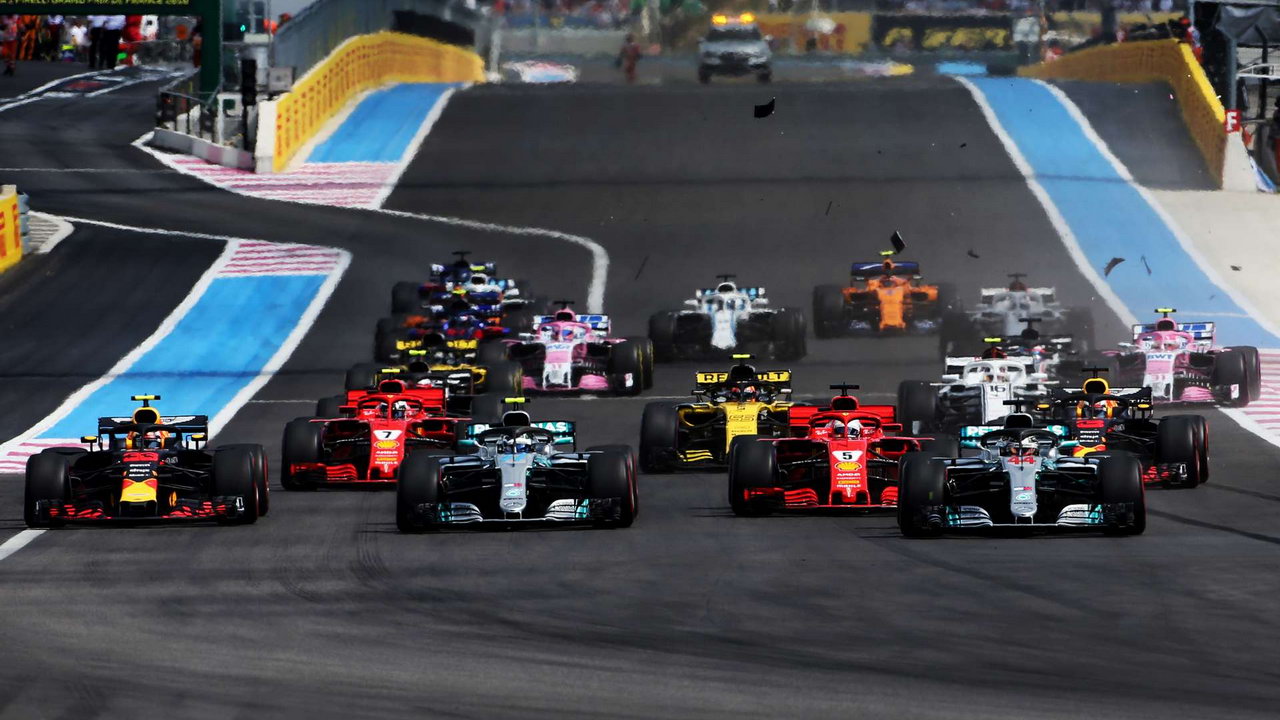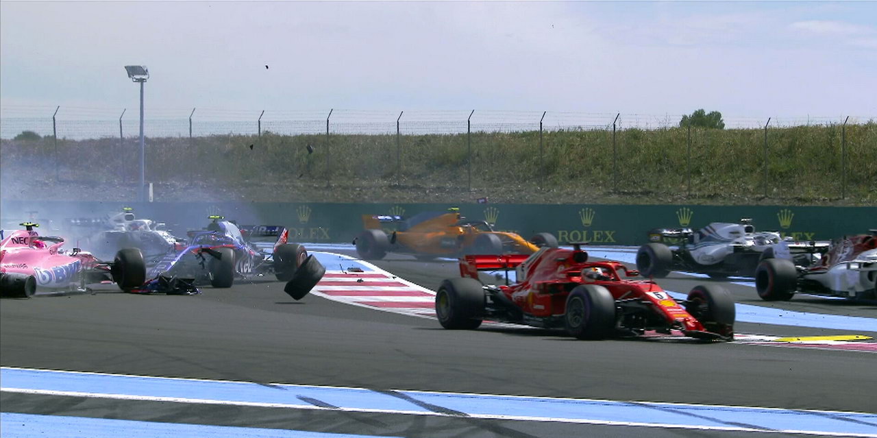 На старте Льюис Хэмилтон сохранил лидирующую позицию, а вот следующие за ним Феттель и Боттас столкнулись уже в первом повороте, отправились в боксы для ремонта и вернулись лишь 17 и 18-м. Кроме того, Гасли врезался в Окона и оба французских гонщика выбыли из борьбы на домашней трассе. Чтобы не попасть в аварию добрая половина пелетона была вынуждена выскочить за пределы трассы. Выехал автомобиль безопасности, а стюарды наказали Феттеля пятисекундным штрафом.