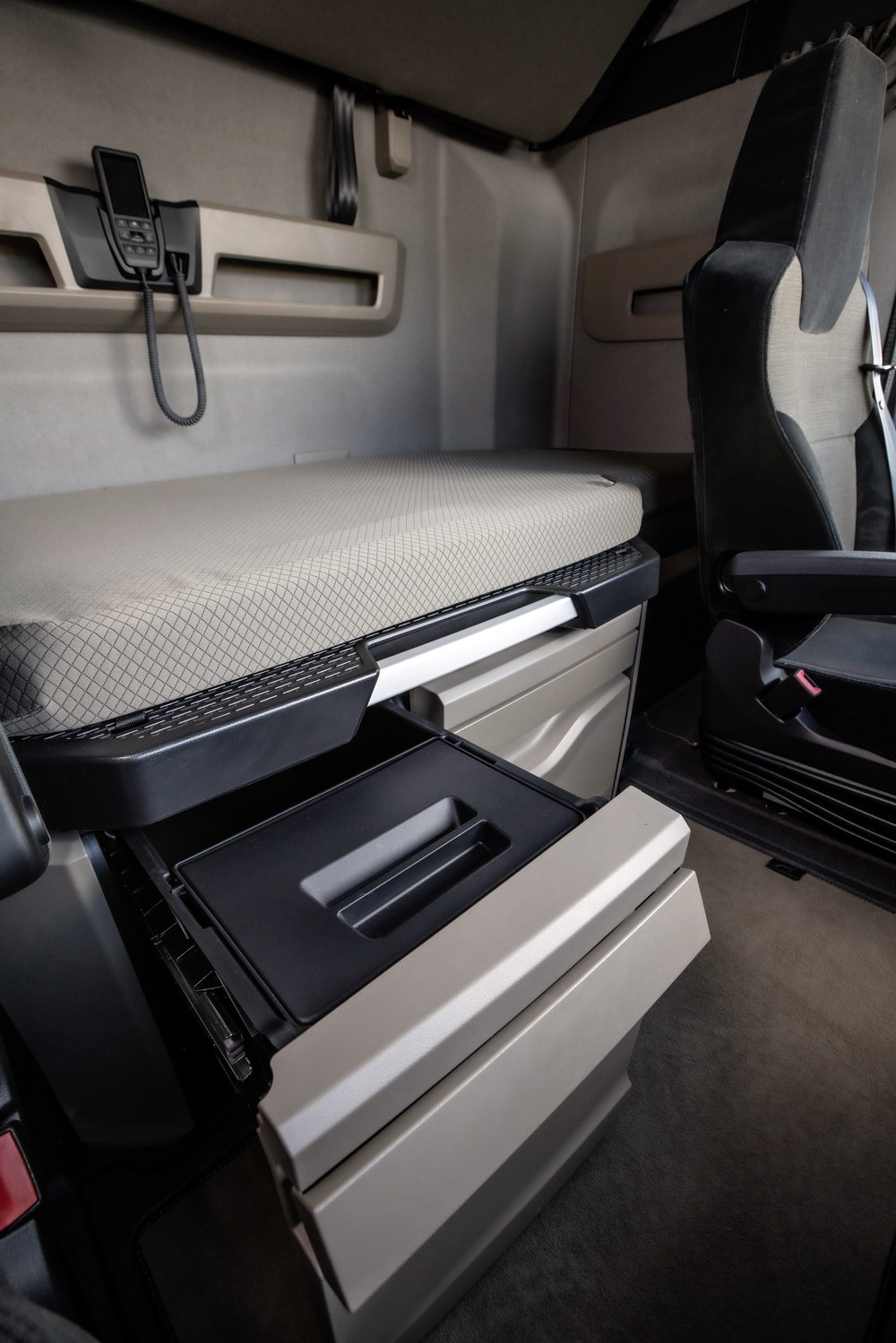 Вершина этой философии – конечно, кабина флагмана MAN, магистрального тягача TGX. Она стала ещё просторнее, получила ещё более вместительные вещевые отделения, особо комфортные спальные места с ортопедическими гипоаллергенными матрасами (всерьёз подозреваю, что у многих водителей домашние кровати менее удобны!).