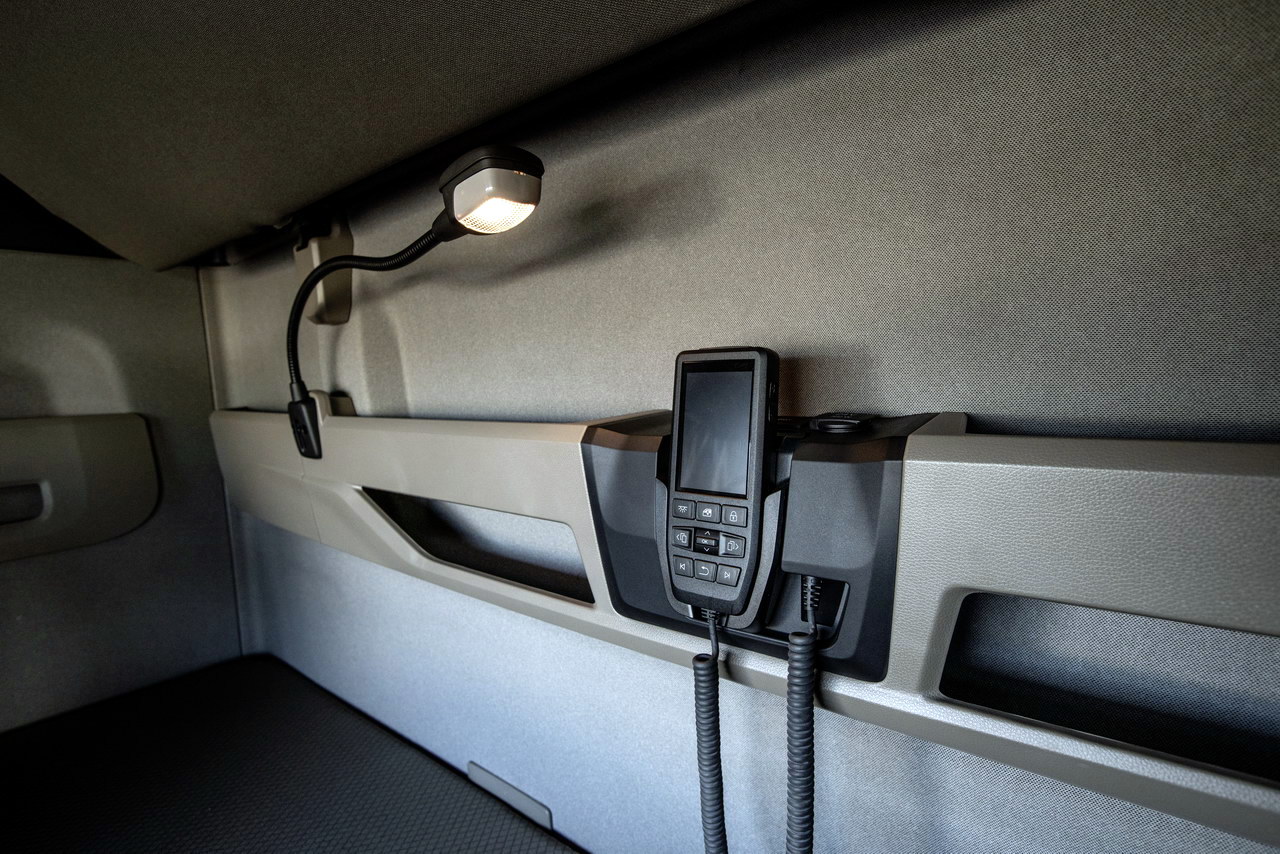 Колоссально продуманы цветовая гамма и освещение. Кабина оформлена в мягких пастельных тонах тёплых оттенков, освещение – не только энергосберегающее (куда ж без этого нынче!) и мягкое, но ещё и умно настраиваемое. Причём точки света есть везде, где они только могут потребоваться. Основные потолочные плафоны – с приятным ночным режимом: лёгкий красноватый свет, как в кокпитах самолётов – проверенный идеальный рецепт из авиации. К услугам водителя, пожелавшего почитать расслабляющий роман на сон грядущий, возлегая на спальной полке, – фонарики на гибких ножках. Подсвечены, конечно, и шкафы, и ниши. А вот когда свет, напротив, не нужен – на помощь придут шторки: завесить можно все стёкла и даже личное пространство каждого из спальных мест.