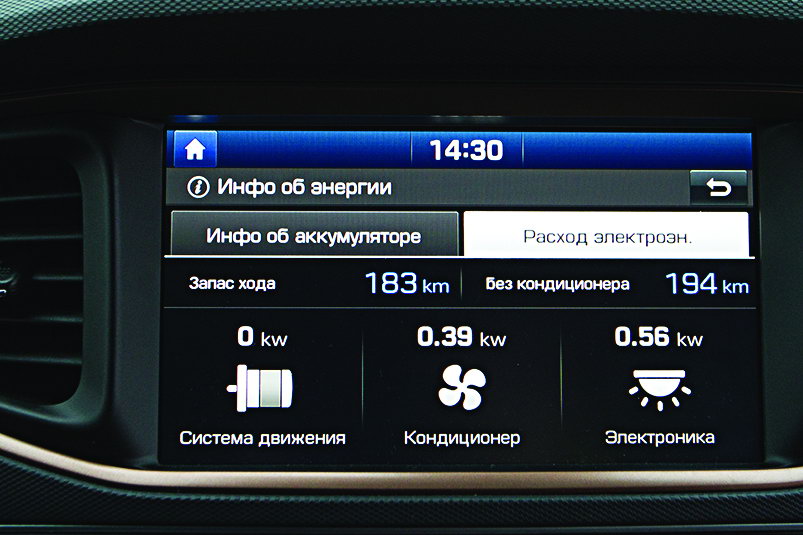 Нажимаю кнопку пуска – и почти ничего, только панели засветились. Собственно, это ощущение для меня не из новых – на гибридах, давно переставших быть для нас экзотикой, бывает точно так же. Но Ioniq всё же озадачивает: цифрой запаса хода, которая тут же неумолимо высвечивается прямо перед моими глазами в центре спидометра. Машину только-только отключили от розетки, зарядив на 100% – и она сообщает, что готова проехать лишь 205 км. Вот это поворот – в сравнении с заявленными производителем 280 км, как говорится, «маловато будет». Куда же на довольно новом авто с общим пробегом около 6 тысяч успело подеваться почти 27% запаса хода?