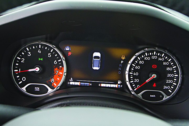 Впрочем, проектировали его американские инженеры, и от донора Renegade ушел очень далеко – у него свой, более жесткий кузов с короткими свесами и клиренс от 175 до 220 мм, в зависимости от версии. А еще – независимая подвеска (стойки МакФерсона спереди и сзади) с внушительным ходом и впечатляющей энергоемкостью. Но ею я начну восхищаться чуть позже, а пока играю в увлекательный квест, отыскивая в салоне фирменные дизайнерские изюминки в дополнение к тем, которые уже нашлись на кузове Отступника. Одни связаны с историей марки, другие же – просто стильные штучки, изящный способ подчеркнуть имидж «проходимца». Вот надпись «since 1941», венчающая консоль и отсылающая ко времени начала производства того самого Willis MB. Вот часть его же мордашки – вертикальные прорези решетки с круглыми фарами по бокам, проступающие на серебристой окантовке колонок аудиосистемы. Вот горизонтальная ручка, протянувшаяся почти через всю правую половину приборной панели. Пассажиру привычнее и сподручнее держаться за ту, что под потолком, но ведь так не интересно! Интересно – когда не так, как у всех. Когда на салонном пластике обнаруживаешь рисунок в виде какой-то загадочной военной карты, а красная зона тахометра стилизована под оранжевую кляксу, намекающую на цвет американских каньонов.