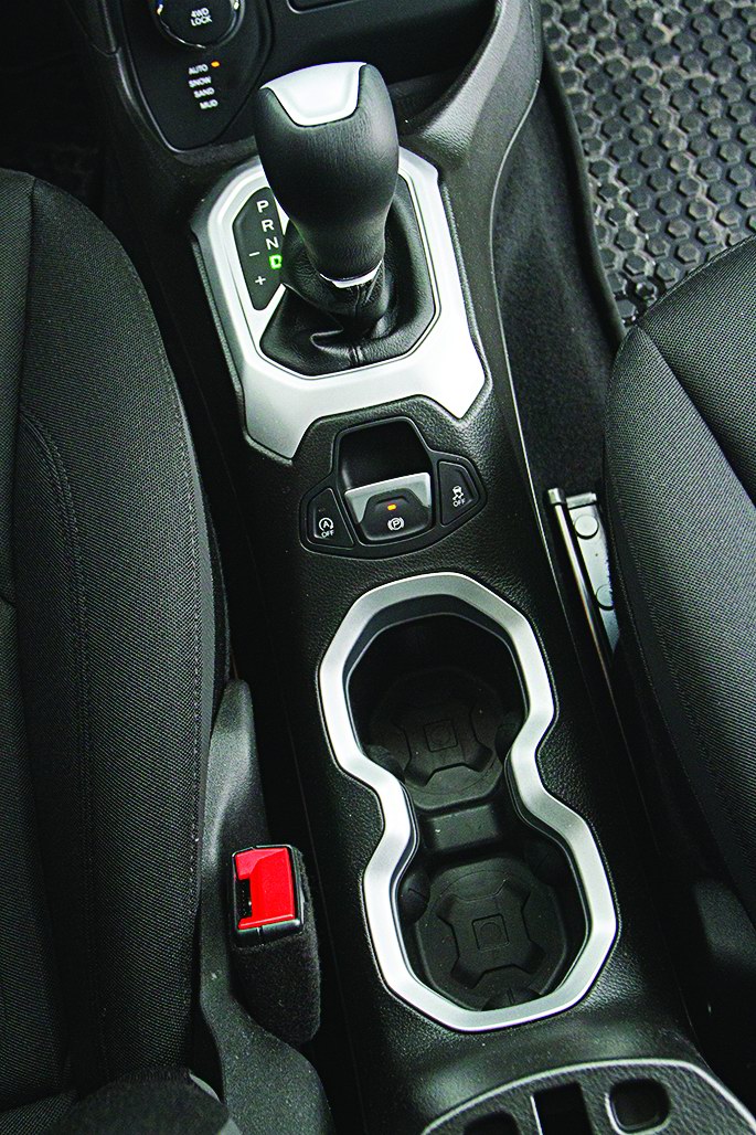 Коробка у тестового автомобиля – такой же 9-ступенчатый автомат, как и у версии Trailhawk, и со столь же тяговитой первой передачей. Почувствовать это можно, выезжая утром с парковки. Пока автомат не прогрелся, Renegade трогается с места на первой даже на асфальте – кажется, он готов соскрести верхний его слой протектором своих шин. А уж после каждый старт начинается со второй.