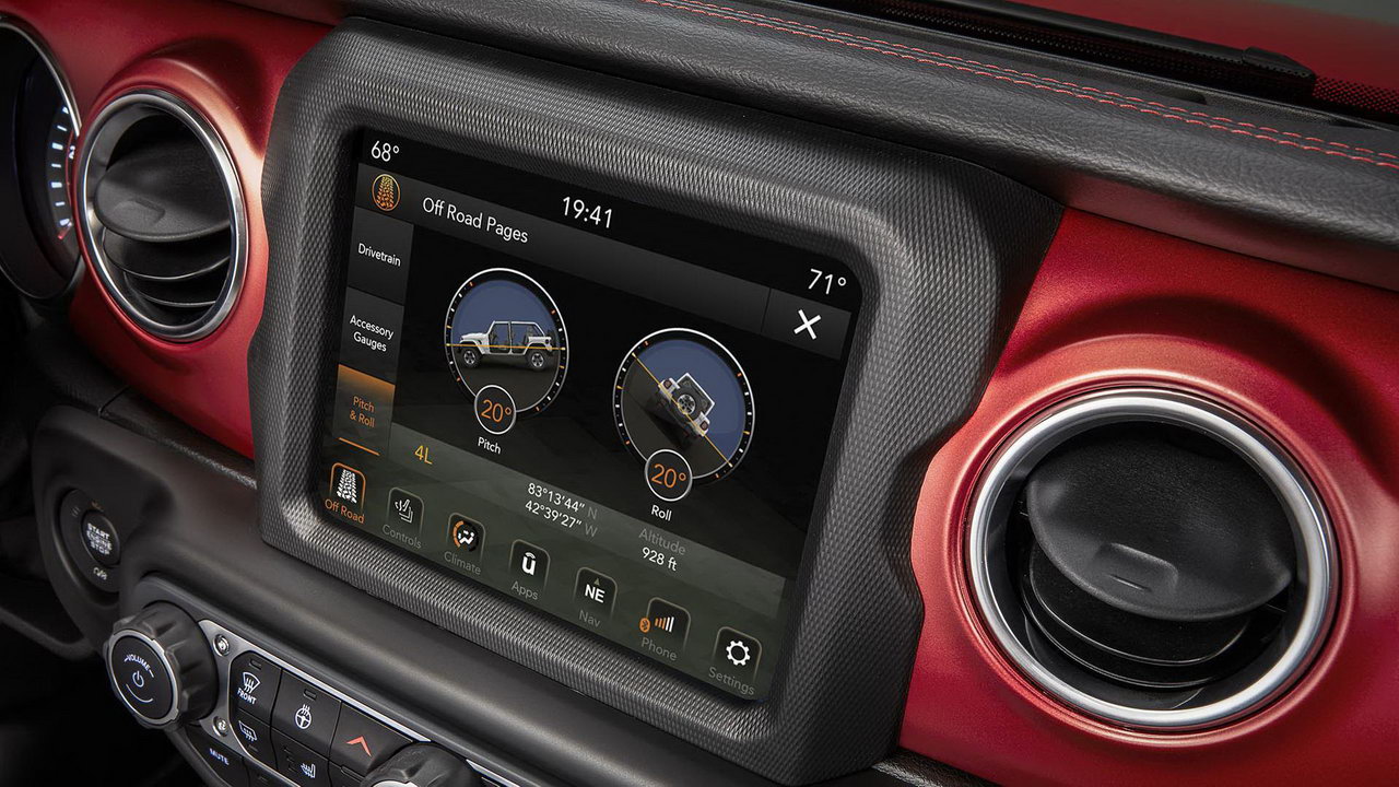 Интерьер нового Jeep Wrangler стал гораздо роскошнее – обивка сидений с контрастной прострочкой, цветной экран приборки, медиасистема Uconnect с 8,4-дюймовым сенсорным дисплеем, двухзонный климат-контроль и т.д.