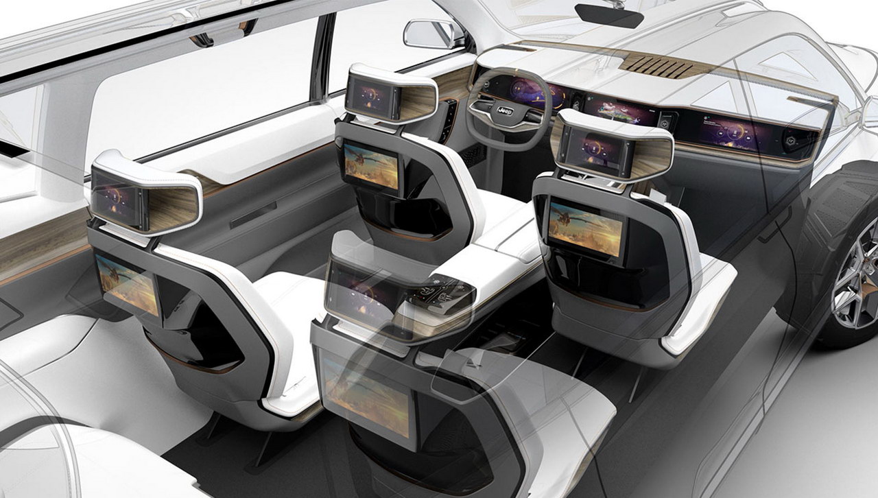 Салон внедорожника отделан кожей с деревянными вставками и просто пестрит дисплеями: их у Yuntu одиннадцать дисплеев – по всей ширине передней панели, а также в подголовниках и спинках сидений.