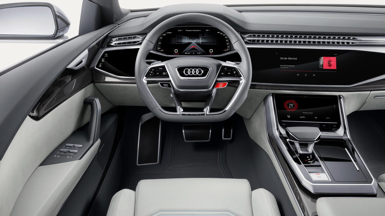 Внутри салона – цифровая приборная панель Audi virtual cockpit, сенсорный блок управления климатом для передних и задних пассажиров и тачскрин мультимедийной системы на передней панели.