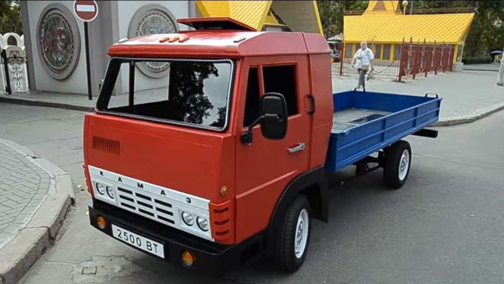Электромобиль получил точную копию кабины КАМАЗа, правда, уменьшенную в два раза. В раме самоделки установлена небольшая 24-килограммовая батарея емкостью 5,8 кВт∙ч, обеспечивающая грузовику 60 километров пробега. Время зарядки от бытовой электросети занимает около двух часов.