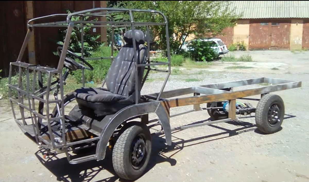 В салоне рулевую колонку взяли от «Жигулей», от которых взяли и реактивные тяги. От ВАЗа позаимствовали и колеса. А вот комфотрные сиденья взяли от Smart. В подвеске установлены 8 газомасляных амортизаторов от мотоцикла, а ведущий задний мост снабжен электромотором на 2,5 кВт.