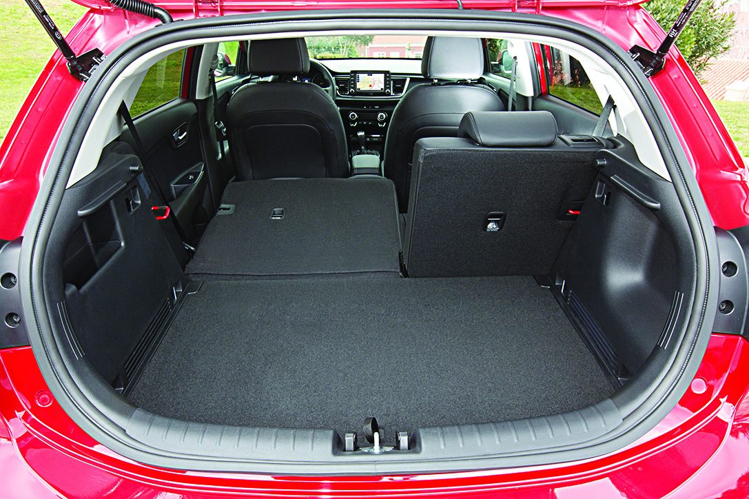 Несмотря на сократившуюся высоту, Kia Rio четвертого поколения оставляет достаточно места над головами седоков: высота салона спереди и сзади составляет 1020 и 850 мм соответственно. Пассажиры галерки еще и вкушают прелести растянувшейся на сантиметр колесной базы – шанс упереться коленями в спинку передних кресел оставлен только очень высоким гражданам. Даже багажник вырос на 37 литров, достигнув объема в 325 л. Мало? Сложите задние сиденья – такая возможность предусмотрена даже в базовом оснащении. Получите 980 л для поклажи.