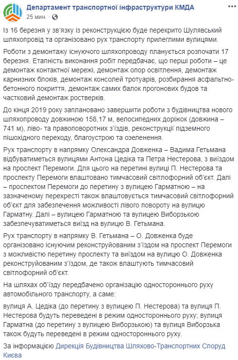По плану демонтажные работы основных конструкций моста планировалось начать еще в ноябре прошлого года. В связи с перекрытием Шулявского путепровода движение транспорта перенаправлено по прилегающим улицам.
