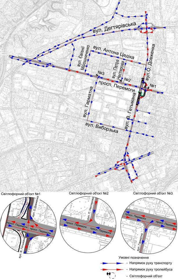 Движение транспорта в направлении В. Гетьмана – А. Довженко будет организовано существующим реконструированным съездом на проспект Победы с возможностью пересечения проспекта и выездом на улицу Довженко реконструированным съездом, где также устроят временный светофорный объект.