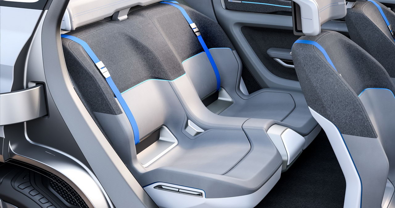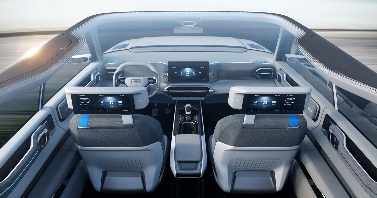 В салоне с посадочной формулой 2+2 задний ряд сидений сплошной, а между передними креслами расположена массивная консоль. Вместо традиционной приборной панели использована отделочная серая ткань, на которую проецируются показания приборов. По центру передней панели расположен большой сенсорный экран информационно-развлекательной системы, еще пара экранов для задних пассажиров встроена в подголовники передних сидений.