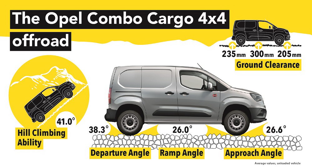 Фургон Opel Combo Cargo 4×4 уже в стандартном оснащении получает не только полный привод, но также систему ESP, защиту двигателя и коробки передач, увеличенный на 90 мм клиренс. Доступна для него и система обзора Surround Rear Vision. ЗР