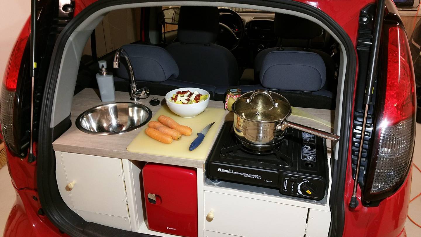 Напомним, что багажник этого автомобильчика вмещает всего 227 литров, и в этом крохотном объёме Гевин умудрился разместить плиту с газовым баллоном, холодильник, раковину со смесителем, бак с чистой водой и моторчик от стеклоомывателя для ее подачи, а также ёмкость для отходов.