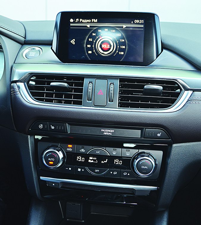Этот экранчик в различных комплектациях выглядит по-разному. Во всех исполнениях Мазды 6, кроме топовых, он маленький и монохромный. А в максимальных оснащениях – крупный и цветной, называется ADD и обладает бoльшим функционалом. Например, по желанию водителя демонстрирует красивый компас и детали предстоящего техобслуживания. К тому же только на экране ADD можно одновременно увидеть средний и моментальный расход топлива.