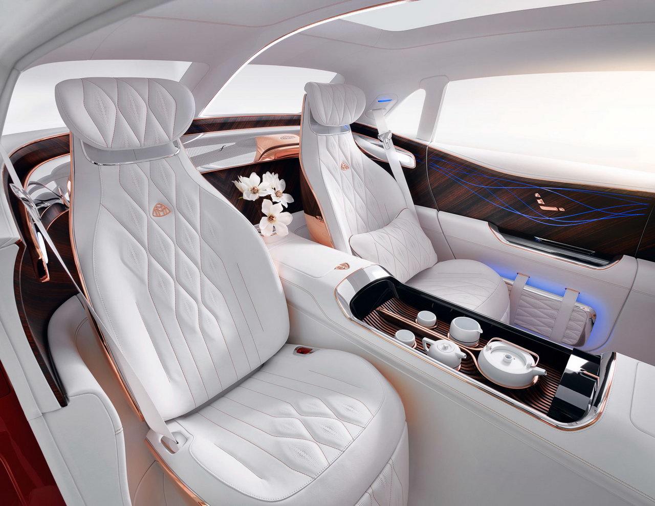 В салоне передняя панель полностью цифровая с двумя 12,3-дюймовыми дисплеями, а мультимедийная система обладает искусственным интеллектом, способным к самообучению – умеет подстраиваться под вкусы владельца, запоминая, к примеру, его любимую музыку, аромат встроенного освежителя и даже предпочтительный сорт чая – седан оборудован встроенным между задними креслами подогреваемым отсеком с набором фарфоровой посуды для чайной церемонии.