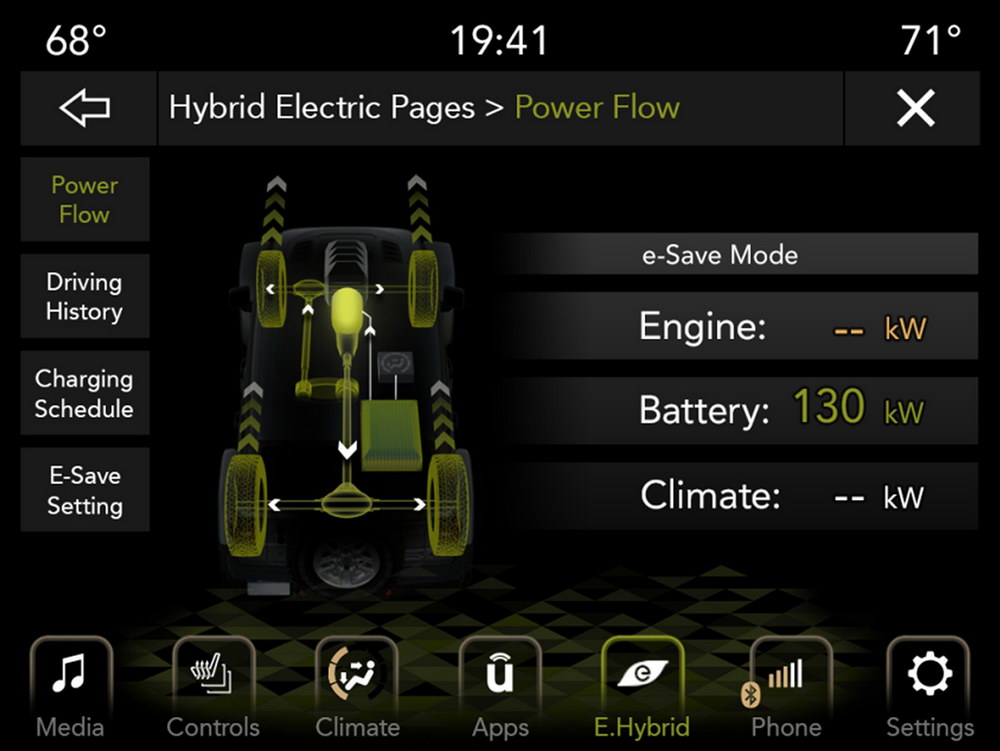 Суммарная отдача гибрида составляет 380 л.с. и 637 Н∙м, на чистой электротяге внедорожник сможет проехать до 40 километров. Доступно три режима работы силовой установки – комбинированный (Hybrid), бензиновый (eSave) и полностью электрический (Electric). В базовую комплектацию входят восьмидиапазонный «автомат» и система полного привода.