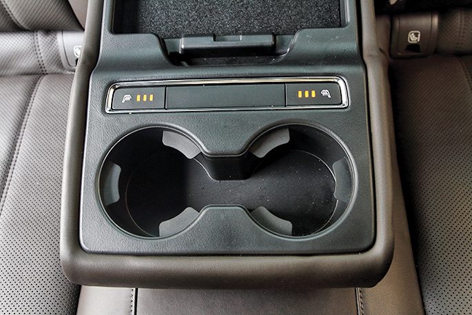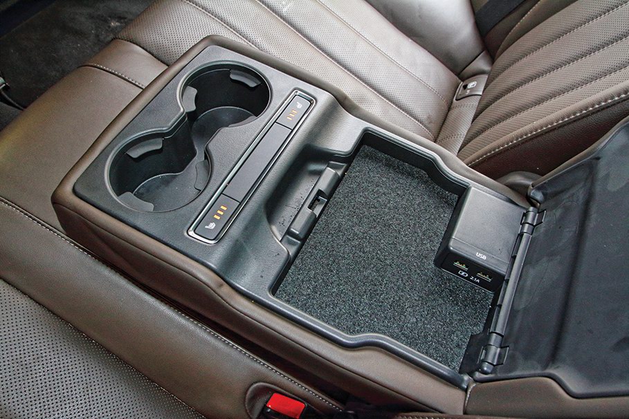Во-вторых, в комплектации Top автомобиль предлагает не только подогрев, но и вентиляцию передних сидений. Задние сиденья нигде не вентилируются, но везде подогреваются: даже базовая версия предложит пассажирам эту неоценимую зимой функцию. Кнопки подогрева явились мне не сразу, поскольку прятались под крышкой подлокотника. Там же обнаружилась черная коробочка с двумя портами USB, обещающая по 2 ампера каждому из задних седоков.