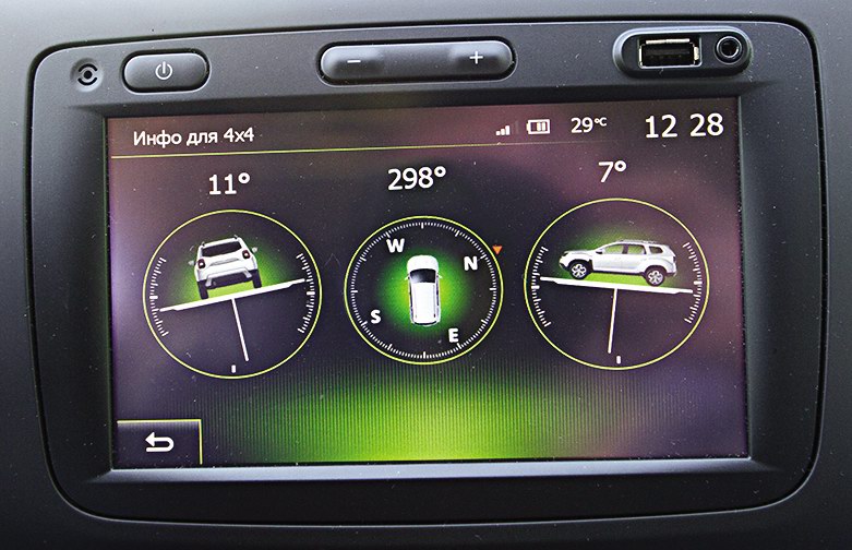 Материалы остались такими же простыми, как и раньше, однако оснащение на голову выросло. Для топ-версии Дастера теперь предлагают бесключевой доступ с пуском мотора кнопкой, мониторинг слепых зон, четыре камеры обзора по всем сторонам автомобиля и климат-контроль. Появились и «фишки» специально для офф-роада: система помощи на спуске, которая берёт на себя управление тягой и торможением, а также внедорожные приборы – на дисплее медиасистемы отображаются компас, продольный и поперечный крены. Медиа, кстати, осталась почти прежней.