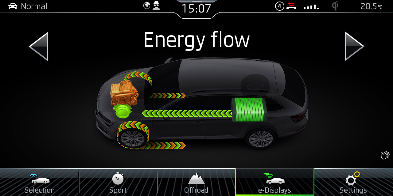 У гибридной Skoda Superb появилось и три режима работы бортовой электроники – спортивный (максимальна эффективность), максимальную отдачу, гибридный (для повседневной езды) и Е-режим (движение на чистой электротяге).
