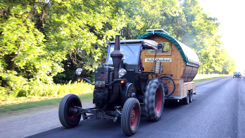 Об этом сообщили наши коллеги из Беларуси, через территорию которой проезжал 70-летний Губерт Вирт. В путешествие немец отправился на тракторе Lanz Bulldog 1936 года выпуска с прицепом в виде огромной пивной бочки, которую он переделал в мобильную баню – там же находится спальное место и кухня.