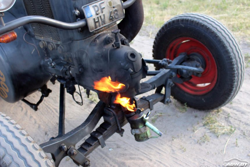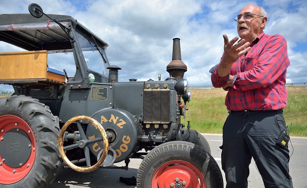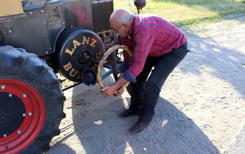 Справка. Трактор Lanz Bulldog 1936 года выпуска оснащен 20-сильным одноцилиндровым двигателем объёмом 4,75 литра, который потребляет около 20 литров солярки на сотню километров пробега.