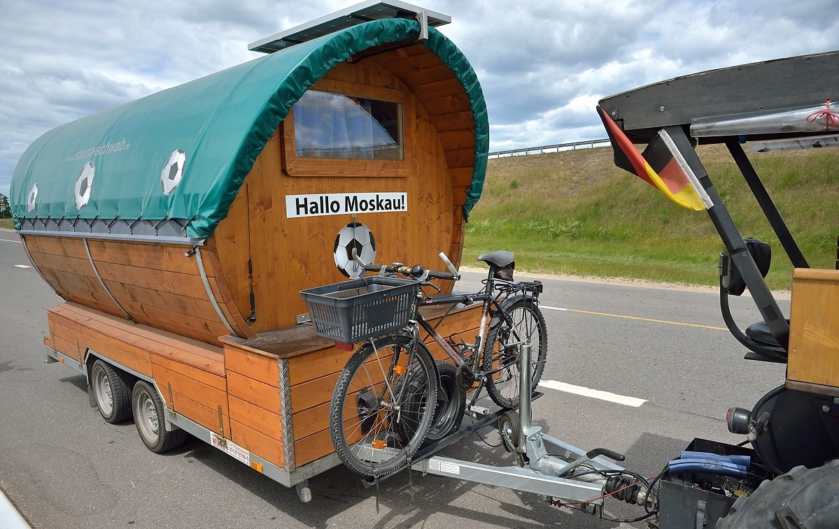 Пенсионер из Германии приехал на Чемпионат мира-2018 на раритетном тракторе с мобильной баней и псом-штурманом.