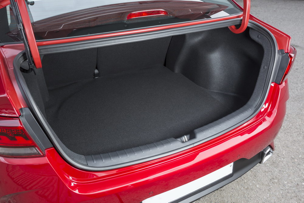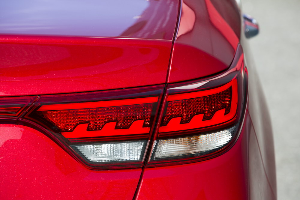Дизайнеры основательно разгулялись в оформлении задней части седана, сделав его задорней и эффектней, чем полагалось бы массовой модели. Через всю крышку багажника протянулась модная линия диодного фонаря, внизу бампера – противотуманка, словно на спорткарах, да ещё и по углам два хромированных треугольника якобы выхлопных патрубков – это притом, что под капотом в любом случае только рядная четвёрка.