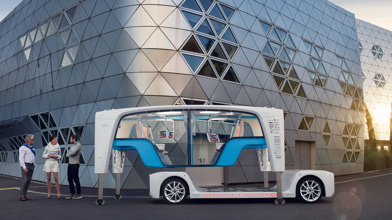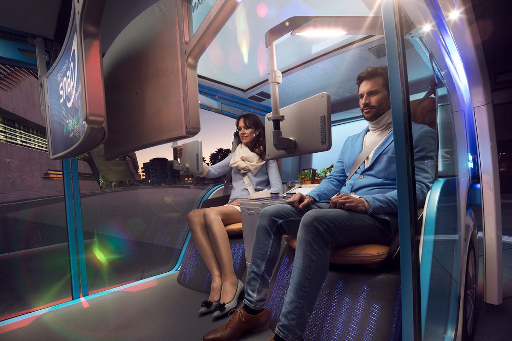 «Фишкой» концепта является возможность использования пассажирской капсулы в качестве жилого модуля или мобильного офиса – во время подзарядки или ремонта самоходной платформы. В салоне шаттла – шесть проекторов. Два проецируют на лобовое и заднее стекло сообщения другим участникам движения, четыре используют проекции на боковых окнах для взаимодействия с пассажирами. Каждый из четырёх пассажиров может пользоваться тремя дисплеями: поворотный предназначен для вывода персональной информации, два других — общие, на них выводятся данные о маршруте, видео с внешних камер и развлекательный контент. Помимо этого, в оснащение концепт-кара входит аудиосистема с объемных звучанием Lexicon.