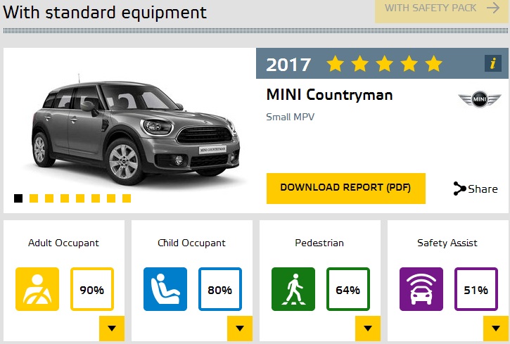 Так же хорошо как Skoda Kodiaq, “выступил” в краш-тестах и новый MINI Countryman: степень безопасности водителя и пассажиров – 90%, детей – в 80%, пешеходов – в 64%, а электронные устройства получили 51%.