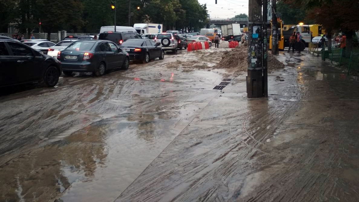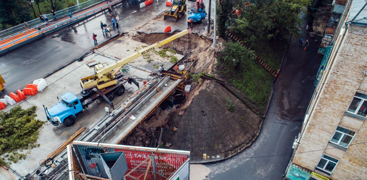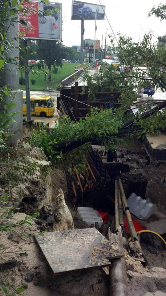 На пересечении улиц Телиги и Кирилловской в Подольском районе Киева частично разрушился путепровод – конструкции вместе с грунтом буквально смыло мощными потоками воды.