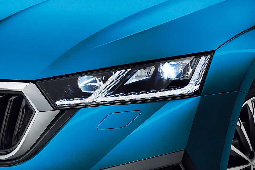 Впервые на Шкоду начали ставить матричные светодиодные фары. При приближении встречного автомобиля в пучке света затемняются отдельные сегменты: фары продолжают освещать обочину дальним, не слепя встречных водителей.