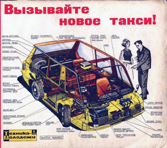 В начале 1960‑х годов известный инженер, конструктор и журналист Юрий Долматовский предложил новую концепцию перспективного автомобиля-такси с однообъемным вместительным кузовом из стеклопластика.