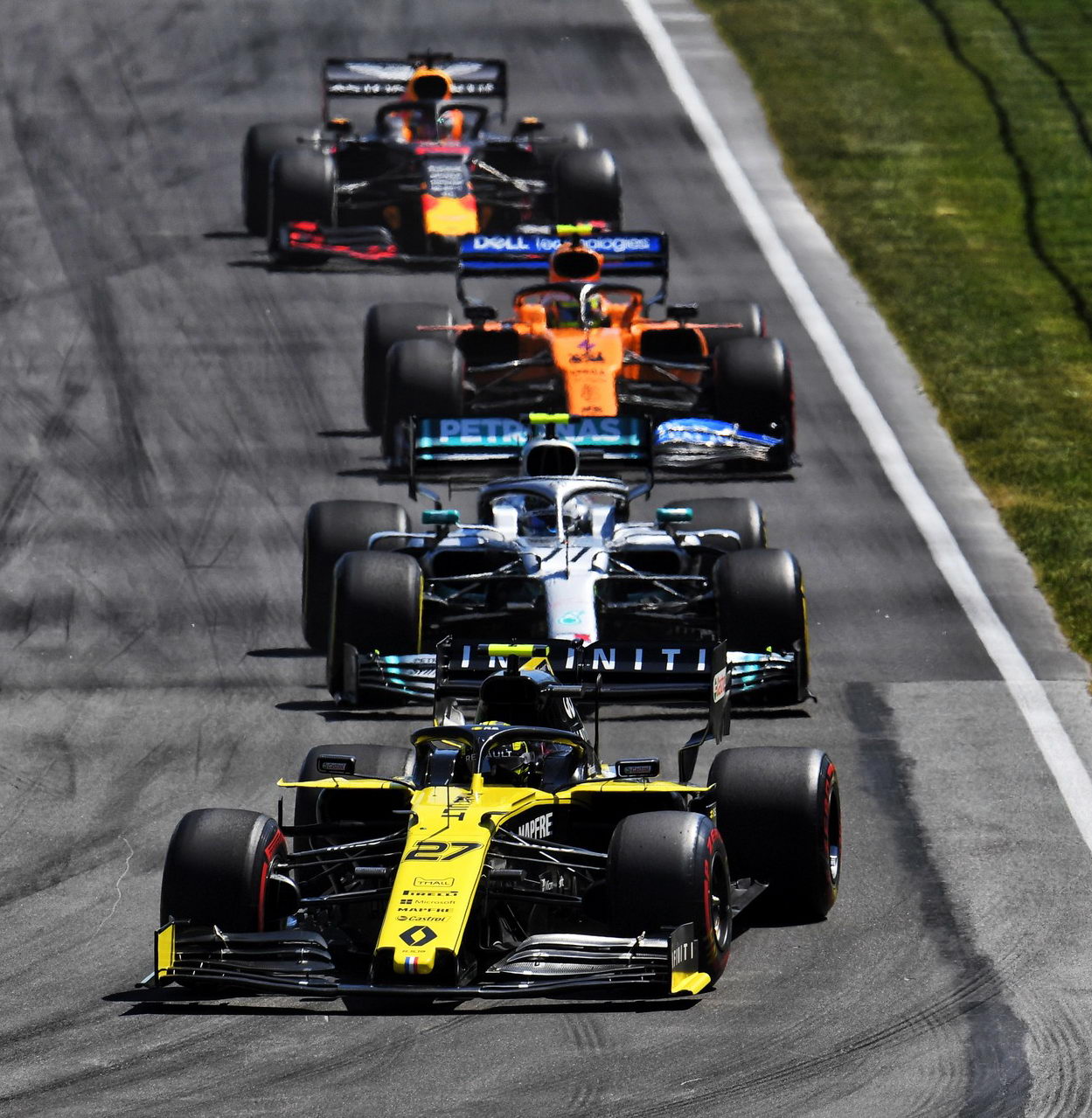 На старте Себастьян сумел удержать лидерство и даже сумел оторваться от преследовавшего его Хэмилтона. Топ- десятка после первого круга выглядела так: Феттель – Хэмилтон – Леклер – Риккардо – Гасли – Хюлкенберг – Боттас – Норрис – Ферстаппен – Квят.